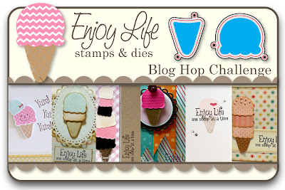 I stamped my ice cream and cone with Colorbox chalk ink on Sweet Tooth cardstock. My oval was cut out with the MFT Oval Stax Die-namics, and the Open Scalloped Doily Duo Die-namics. My borders are the Dot Border Die-namics, in Hot Fudge, and my other card stock colors are Baja Breeze and Orange Fizz. To finish, I used Walnut Seam Binding and Michael's brads.